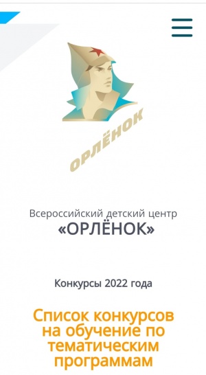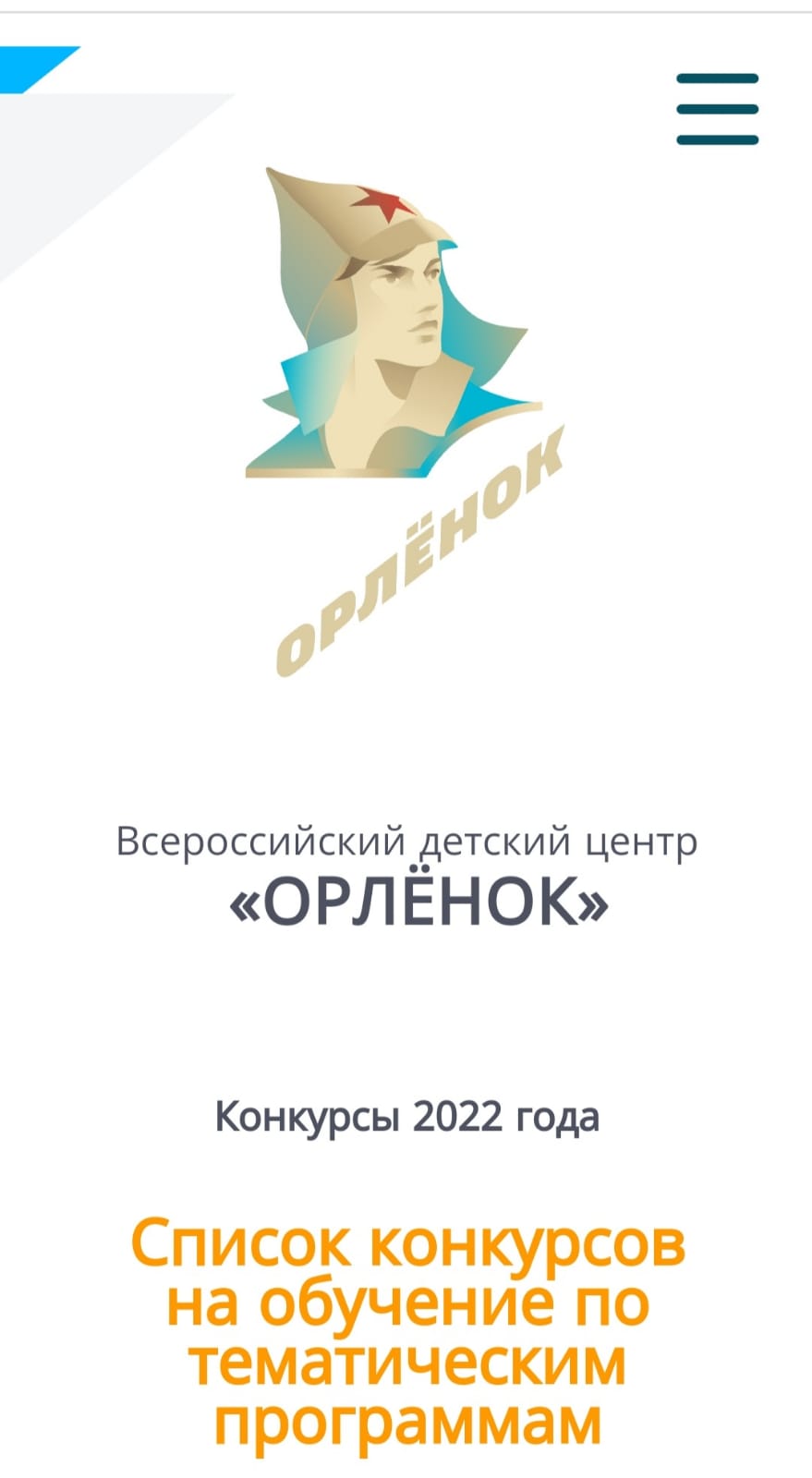 17.03.2022Всероссийский детский центр "Орлёнок " объявил конкурсный отбор на тематические программы различного профиля для школьников от 11 до 16 лет.В случае успешного прохождения конкурсного отбора, дети получат бесплатную путёвку в "Орлёнок ".Вся информация об условиях конкурсного отбора опубликована на официальном сайте Центра-https://center-orlyonok.ru/ru/content/konkurspage.
