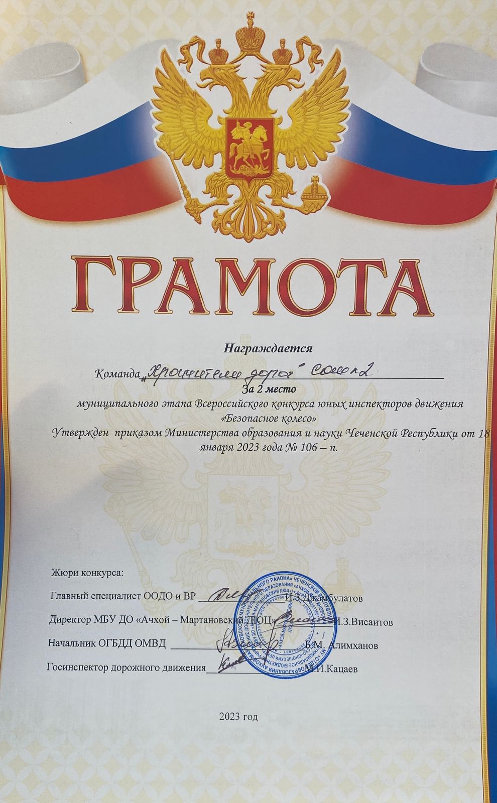 17.03.2023Команда ЮИД «Хранители дорог» МБОУ "СОШ №2 с.Ачхой-Мартан» заняла второе место в районном конкурсе «Безопасное колесо»Конкурс проводился с целью воспитания законопослушных участников дорожного движения, сокращения ДТП с участием несовершеннолетних, формирования у обучающихся культуры здорового и безопасного образа жизни.Командам предстояло пройти 5 этапов конкурса:Творческий конкурс; Знатоки ПДД;Оказание первой медицинской помощи; ОБЖ и фигурное вождение велосипеда.По итогам конкурса команда МБОУ «СОШ2 с.Ачхой-Мартан»заняла общекомандное второе место. Призеры были награждены грамотами.