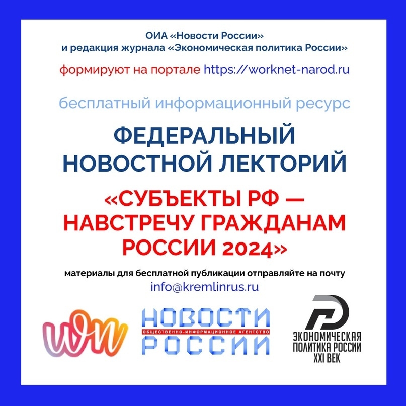 31.08.2023Руководствуясь задачами информирования широких кругов общественности и федеральных органов государственной власти в деле обеспечения регионами России полного исполнения социальных обязательств перед населением, снижения бедности и неравенства, роста благосостояния и качества жизни граждан на основании базовых, интегральных ориентиров развития страны до 2030 года, обозначенных Президентом РФ В.В.Путиным на Заседании Совета по стратегическому развитию и национальным проектам 15 декабря 2022 года, ОИА «Новости России» и редакция журнала «Экономическая политика России» формируют на портале https://worknet-narod.ru/ Федеральный новостной лекторий «Субъекты РФ — навстречу гражданам России 2024» https://worknet-narod.ru/subekty-rf-navstrechu-grazhdanam-rossii-2024-federalnyj-novostnoj-lektorij/ Целью данного бесплатного информационного ресурса является демонстрация эффективных направлений деятельности региональных и муниципальных органов управления касательно повышения общественного доверия к власти в вопросах занятости и трудовых отношений, медицинской помощи, культурно-спортивного, научно-образовательного потенциала, гражданской, финансовой, правовой и социальной защиты населения субъектов Российской Федерации. При подготовке данного Федерального новостного лектория ОИА «Новости России» https://www.kremlinrus.ru/ учитывает основные тезисы Указа Президента РФ В.В.Путина «О национальных целях развития России до 2030 года», в том числе, необходимость увеличения численности населения страны, повышения уровня жизни граждан, создания комфортных условий для их проживания. Более подробная информация здесь — https://worknet-narod.ru/subekty-rf-navstrechu-grazhdanam-rossii-2024-federalnyj-novostnoj-lektorij/ Участники формирования Федерального новостного лектория «Субъекты РФ — навстречу гражданам России 2024» : федеральные, региональные и муниципальные государственные органы управления, а также учреждения, организации и предприятия всех видов муниципальных образований с учетом добавлений Федерального закона от 27 мая 2014 года № 136−ФЗ (сельское поселение, городское поселение, муниципальный район, городской округ, внутригородская территория города федерального значения, городской округ с внутригородским делением, внутригородской район). Актуальные материалы о позитивных достижениях государственных органов управления субъектов РФ и муниципальных образований, освещающие тенденции реализации федеральных программных мероприятий и проектов для бесплатной публикации принимаются на почту info@kremlinrus.ru и будут размещаться здесь https://regioninformburo.ru/category/society/ с их последующим объединением в единую информационную презентацию тут https://worknet-narod.ru/ Формирование Федерального новостного лектория «Субъекты РФ — навстречу гражданам России 2024» информационно содействует идее развития Российской Федерации, несмотря ни на какие внешние давления, выявлению лучших решений и практик, максимально учитывающих интересы, нужды и запросы населения страны.