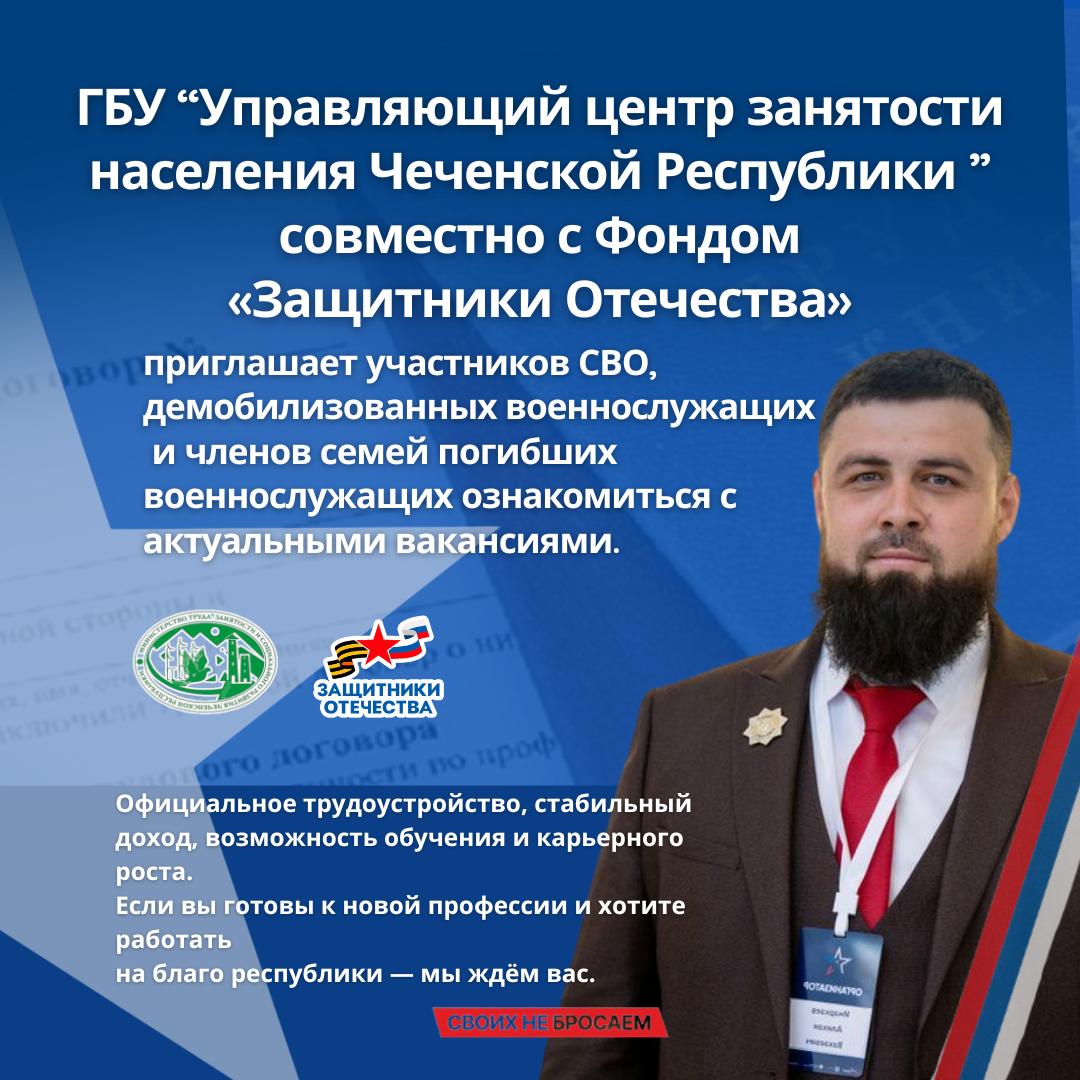 29.09.2025Филиал Государственного Фонда поддержки участников специальной военной операции «Защитники Отечества» в Чеченской Республике совместно с Государственным бюджетным учреждением «Управляющий Центр занятости населения» Министерства труда, занятости и социального развития ЧР объявляет о проведении мероприятия по содействию трудоустройству ветеранов СВО, демобилизованных военнослужащих и членов семей погибших защитников Отечества.