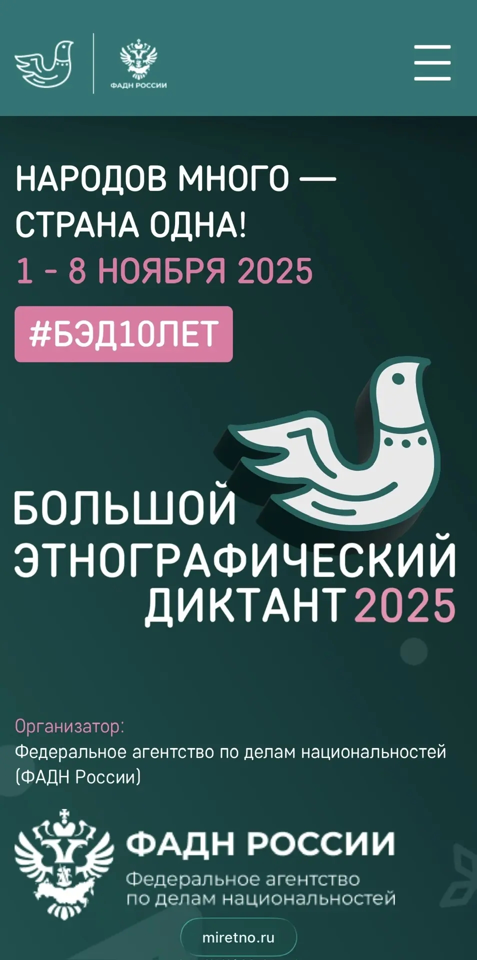 08.11.2025С 1 по 8 ноября 2025 г. во всех субъектах Российской Федерации и зарубежных странах прошла Юбилейная X Всероссийская просветительская акция «Большой этнографический диктант».