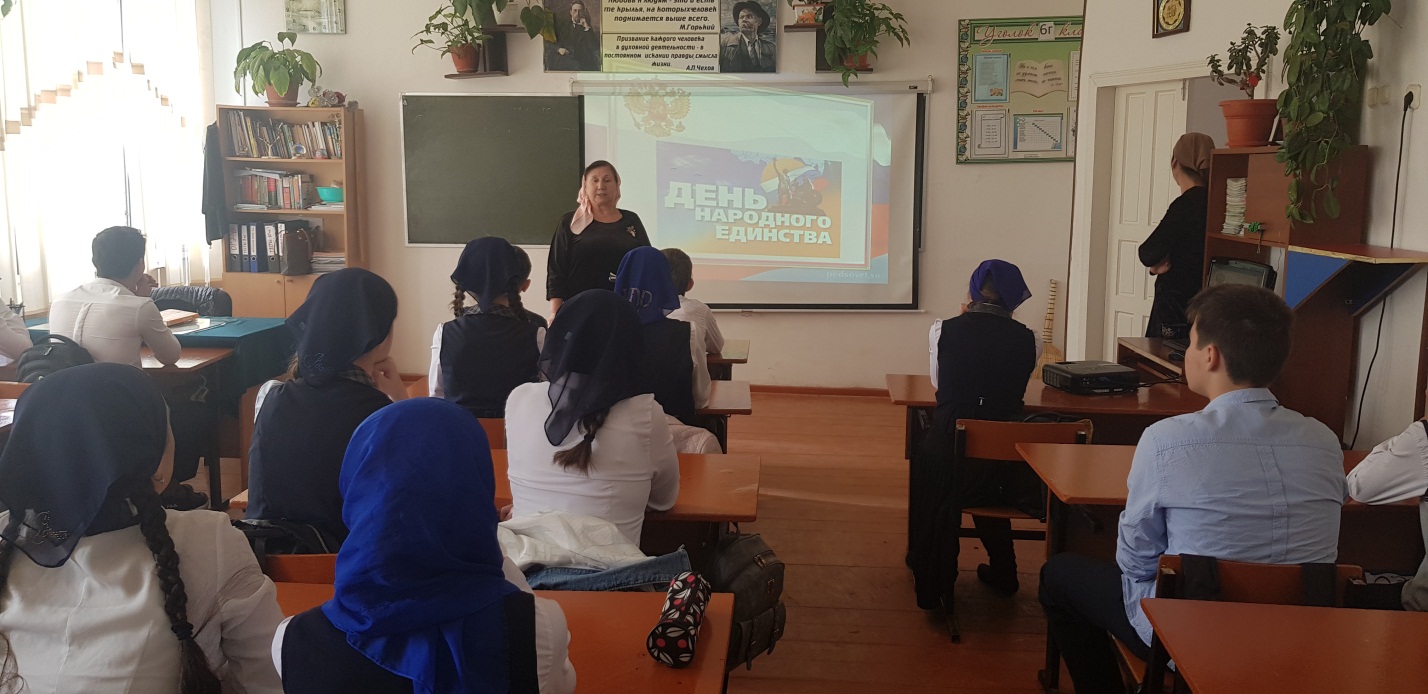 Ученики 8-11 классов участвовали в конкурсе «Все народы едины». Лидия Султановна, вкратце рассказала, что этот праздник связан с окончанием Смутного времени в России в конце 16 начале 17 веков. Дети были вовлечены в мероприятие, в своих докладах рассказали и показали сверстникам об истории разных народов, пели песни на разных языках и участвовали в конкурсе стенгазет.