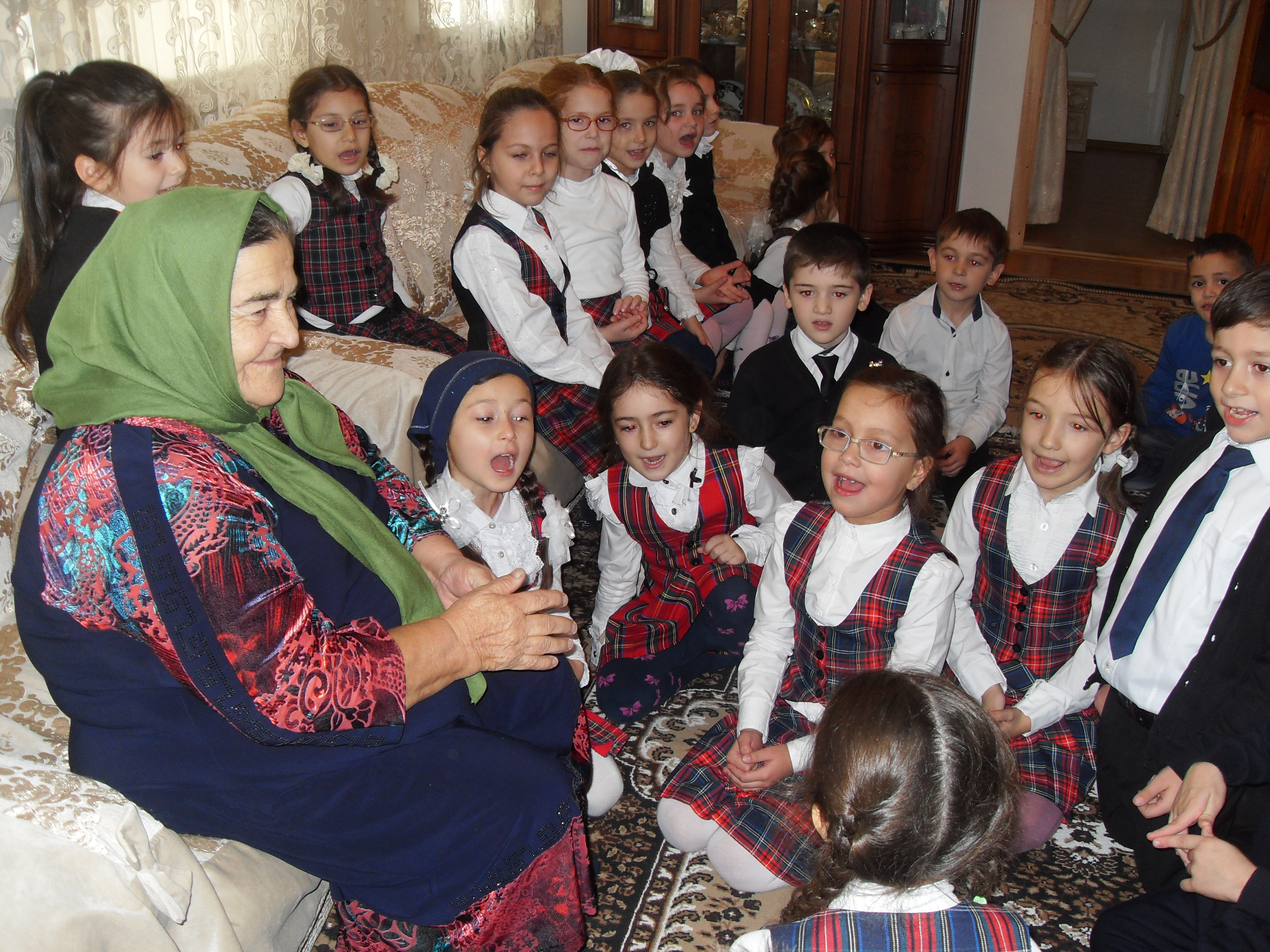 С радушием встретила хозяйка званых гостей. Суетилась, помогая удобнее устроиться в большом доме. Затем пошли рассказы Байсет о своей жизни, ребят об успехах в учебе. Со стороны могло показаться, что дети утром ушли отсюда в школу, а теперь вернулись домой. Разговор продолжился за столом, покрытым различными яствами. Чай, соки, пирожное, фрукты еще больше оживили беседу. Затем пошли песни и танцы. Праздник удался на славу! Уходя, дети пожелали бабушке Байсет долгих лет жизни. Та, в свою очередь, попросила ребят приходить чаще, как к себе домой.